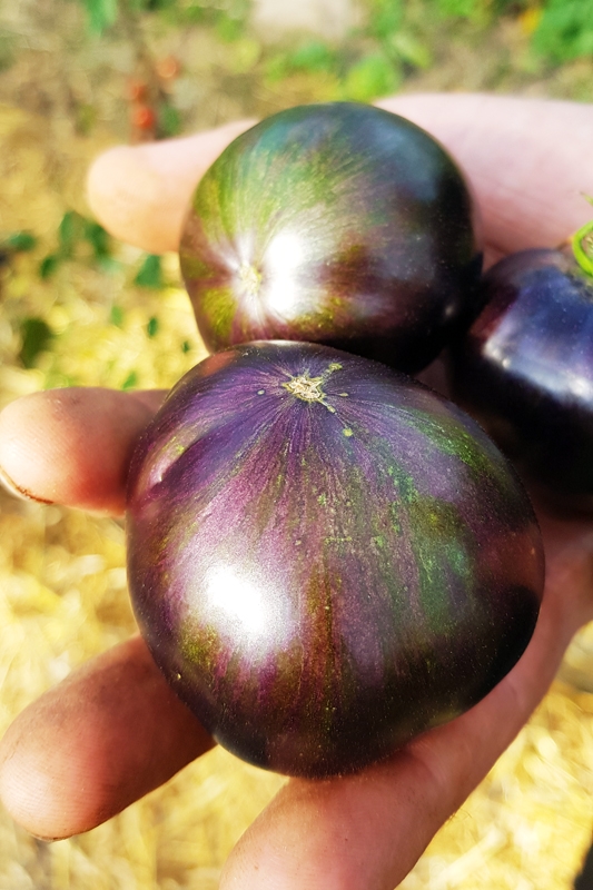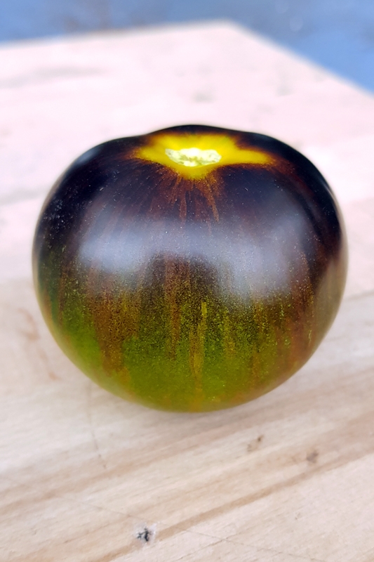 Diese grün-blau gestreifte Stabtomate bringt einen guten Ertrag. Die Früchte sind süß-würzig und haben eine angenehm weiche Schale. Sie eignen sich hervorragend für bunte Tomatensalate.