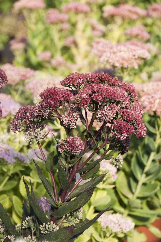 Straffaufrecht wachsende fetthenne mit rosa-roten Blüten. Die dunkelroten Stängel stehen im schönen Kontrast zum rot überlaufenen Laub. Sehr wertvolle und bewährte Sorte die bis lang in den Winter hinein attraktiv bleibt.